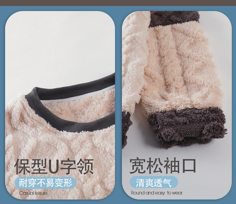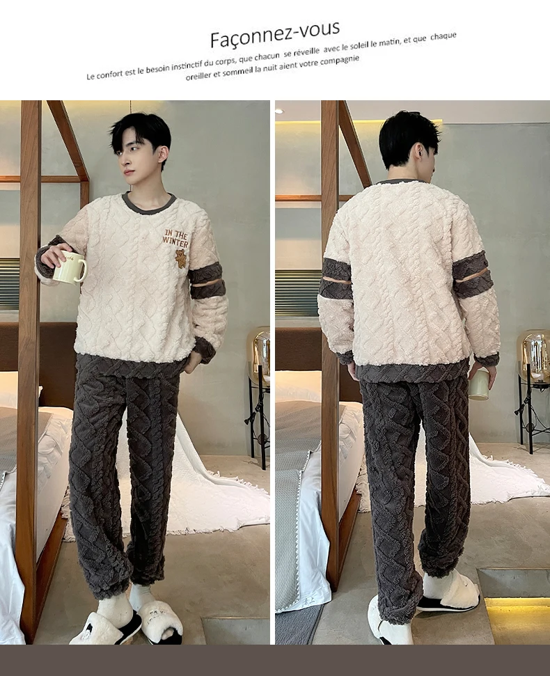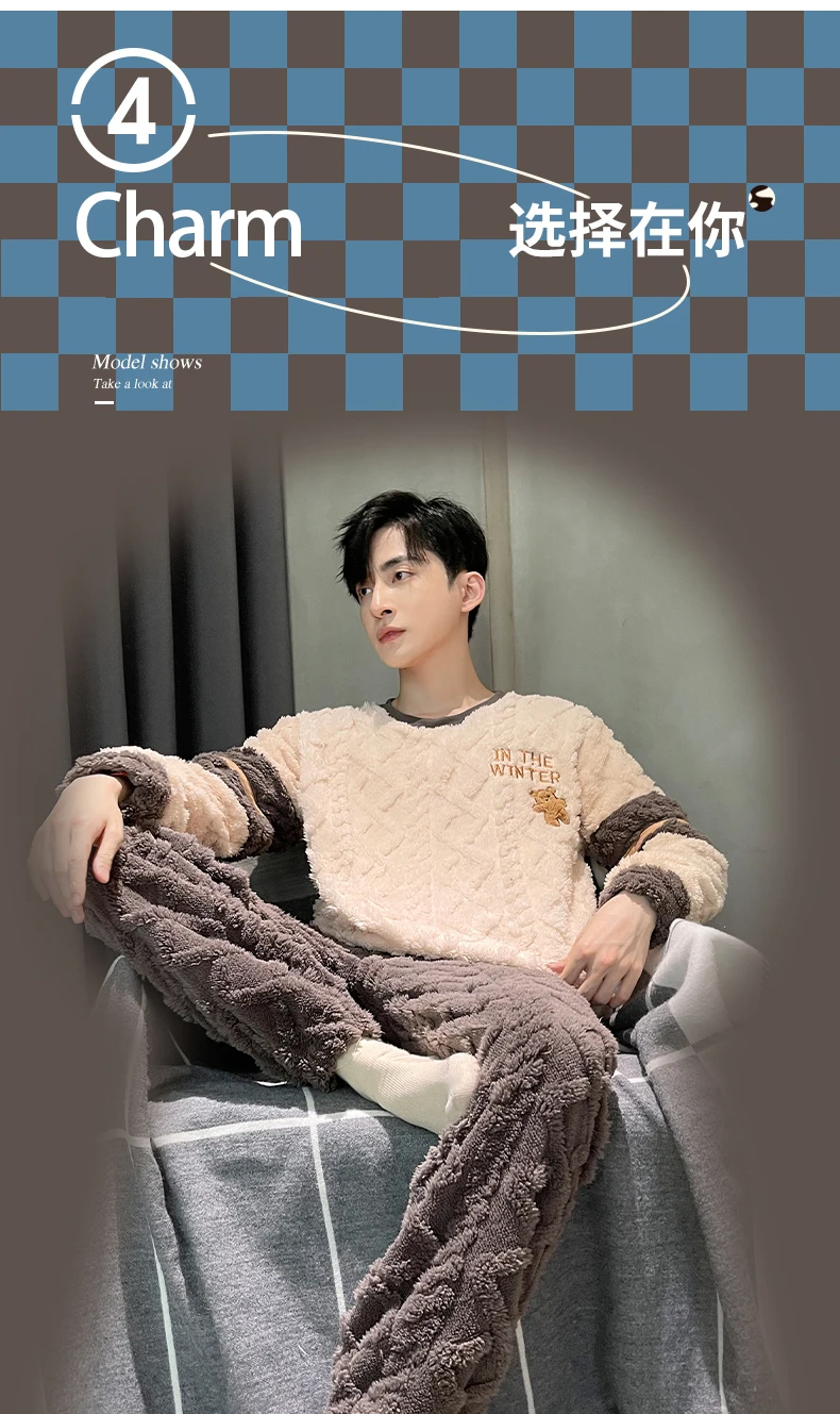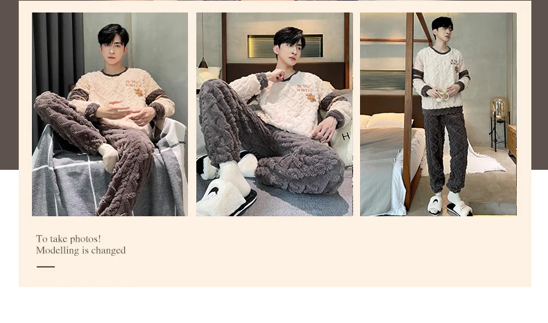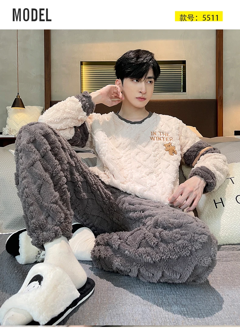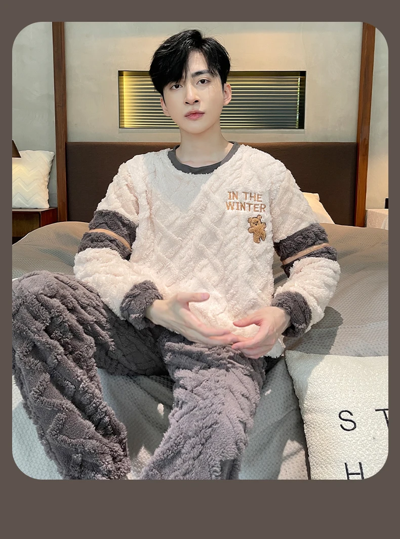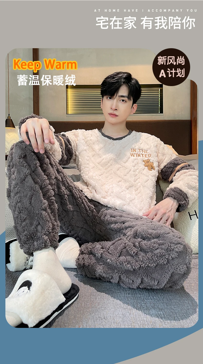 남성용 코랄 플리스 잠옷, 두껍고 벨벳 따뜻한 청소년 대형 플란넬, 가정용 모피 세트, 가을 및 겨울